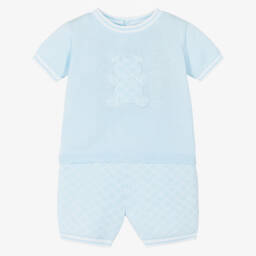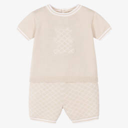 A charming beige shorts set for baby boys by Emile et Rose, finely knitted in soft cotton. The short-sleeved sweater features a sweet diamond pattern teddy appliqué on the front and striped trim around the neck and cuffs. It fastens with pearlescent buttons on the back. The shorts are in a coordinating diamond pattern, with striped trims and a gently elasticated waist for a comfortable fit.