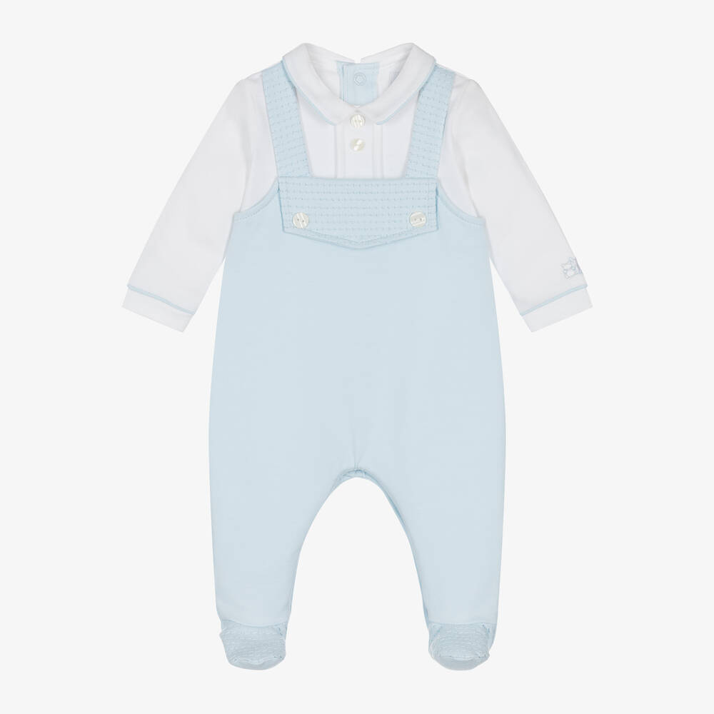 Pale blue and white babygrow for boys by Emile et Rose, made from soft cotton jersey. Designed to look like a top and dungarees, this sweet one-piece has a smart pointed collar and features the brand's cute logo embroidery on one of the long sleeves. There are decorative buttons and stitch detailing on the front and easy to use popper fastenings on the back and between the legs.