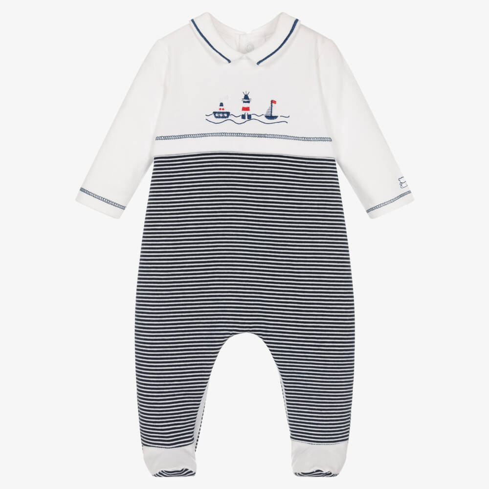 Nautically themed white and navy blue striped babygrow for boys by Emile et Rose. Made in soft cotton jersey, it has a white top half with red and blue embroidery. There are popper fastenings on the back and between the legs, to ensure easy dressing.