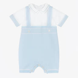 A sweet pale blue and white shortie for baby boys by Emile et Rose. Designed to look like a top with shorts and braces, this charming one-piece has a cotton jersey top and a finely knitted bottom. There is an embroidered pointed collar and decorative buttons on the front, with functioning buttons to fasten on the back and between the legs.