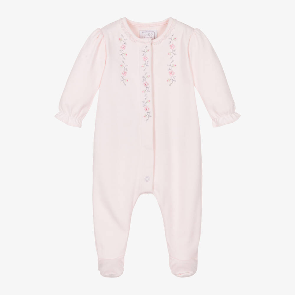 A light pink babygrow for girls by Emile et Rose, made in soft cotton jersey with gently puffed sleeves. This charming design is trimmed with delicate lace around the neckline and embroidered with pretty pink rose buds. It has enclosed feet and a concealed button placket on the front. The frilly cuffs are elasticated for added comfort.