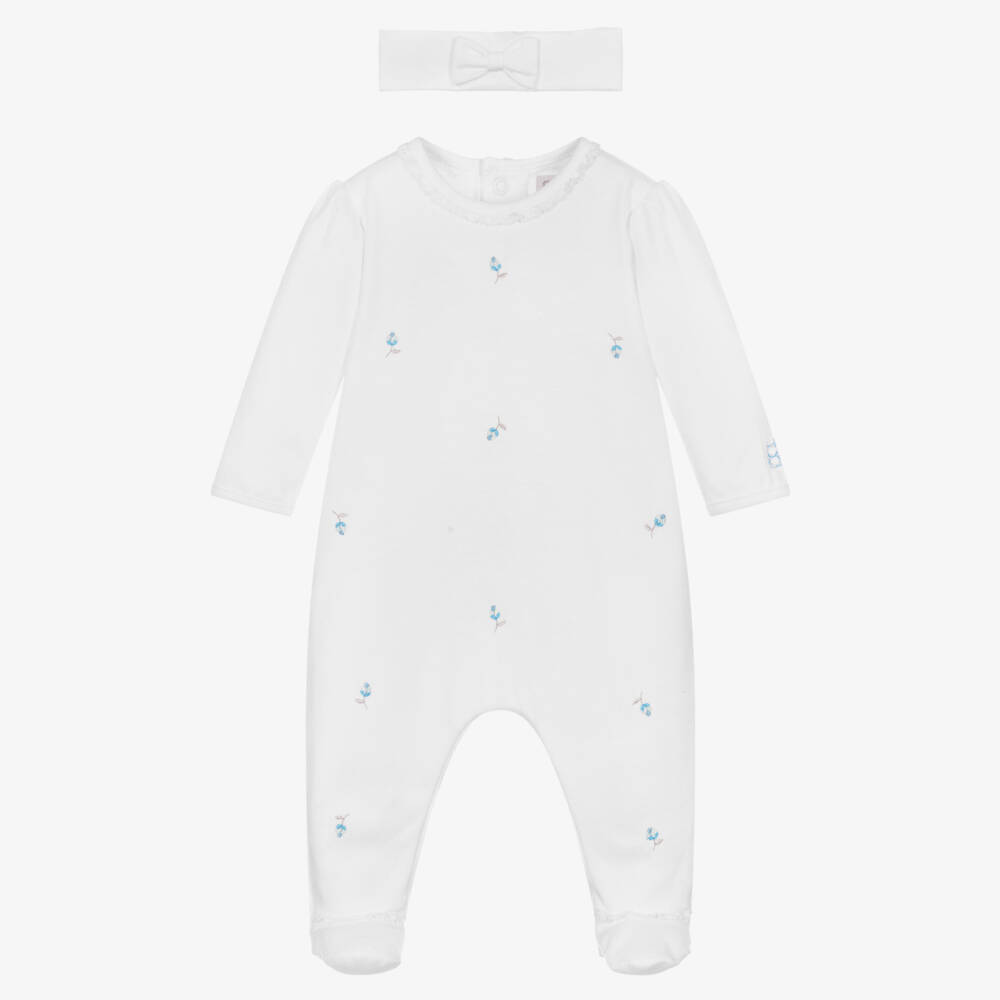Lovely white babygrow and headband set for girls by Emile et Rose, made in soft cotton jersey. The babygrow is delicately embroidered with blue flowers and a logo on one sleeve. Fastening with poppers, it has pretty crochet trims, for a feminine look. The accompanying headband has a bow on the front.