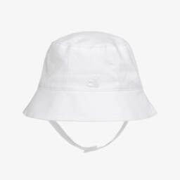 Super soft pale blue cotton jersey sun hat for baby boys and girls by Emile et Rose. Lined for comfort, it has a velcro fastening chin strap and embroidered white logo branding on the front.