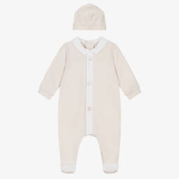 A charming pale blue babysuit set for boys by Emile et Rose, made in soft cotton jersey for a gentle feel against delicate skin. Embroidered with cute nursery toys down the front, the sweet babygrow has a little, white twill collar. It comes with a double-layered, picot-trimmed layette hat featuring the designer's adorable logo motif, matching that on the sleeve of the babygrow.