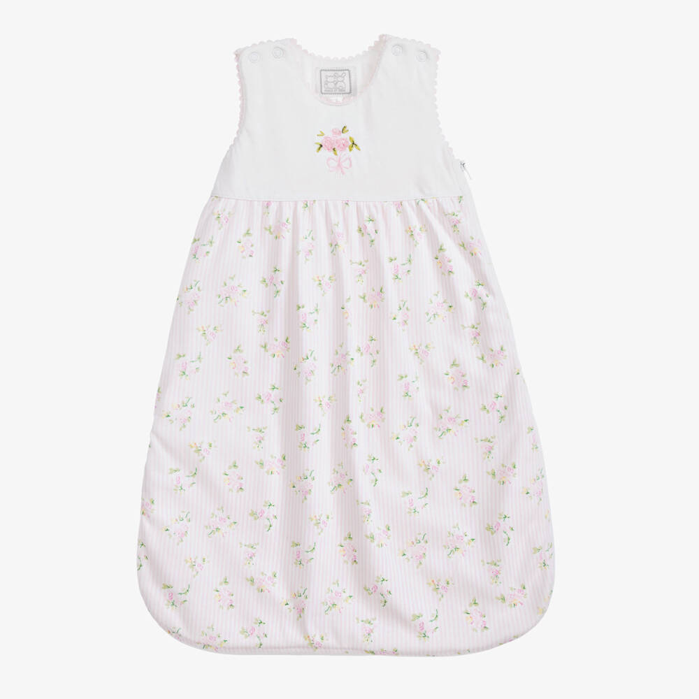 Baby girls pink and ivory cotton sleeping bag from Emile et Rose, with a pretty striped floral pattern. It has two popper fastenings on each shoulder, a pink floral embroidery on the front and pink ricrac trims. Lightly padded with a soft and lightweight lining, it fastens with a side zip that extends across the bottom. A practical addition to your nursery but also perfect for travelling.