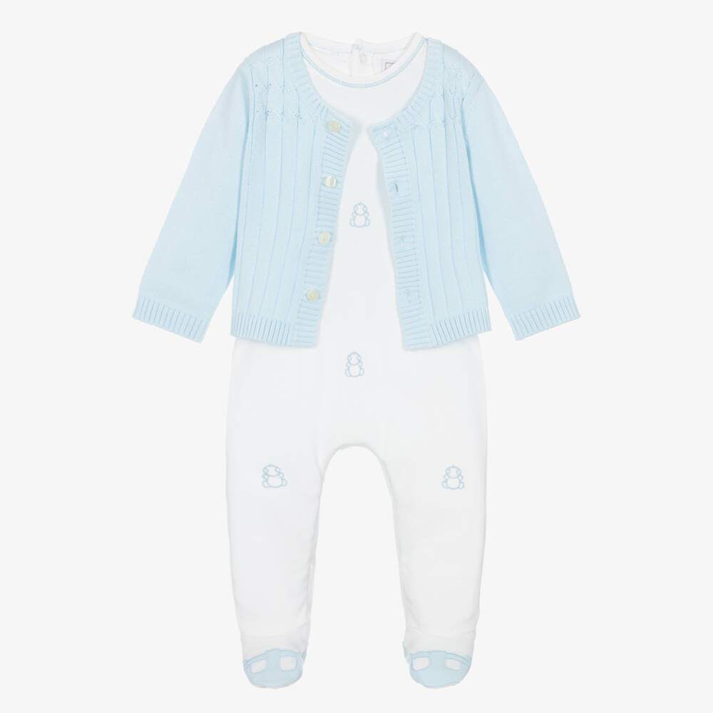 Adorable white babygrow and pastel blue cardigan set for boys and girls by Emile et Rose, made with soft, breathable cotton. The soft jersey babygrow is patterned with pastel blue embroidered bears and has cute shoe details on the feet. It fastens with poppers on the back and between the legs. The sweet cardigan has a ribbed pattern on the front with cable detail on the shoulders. A classic, timeless style, it has soft ribbed trims and pearlised button fastenings.