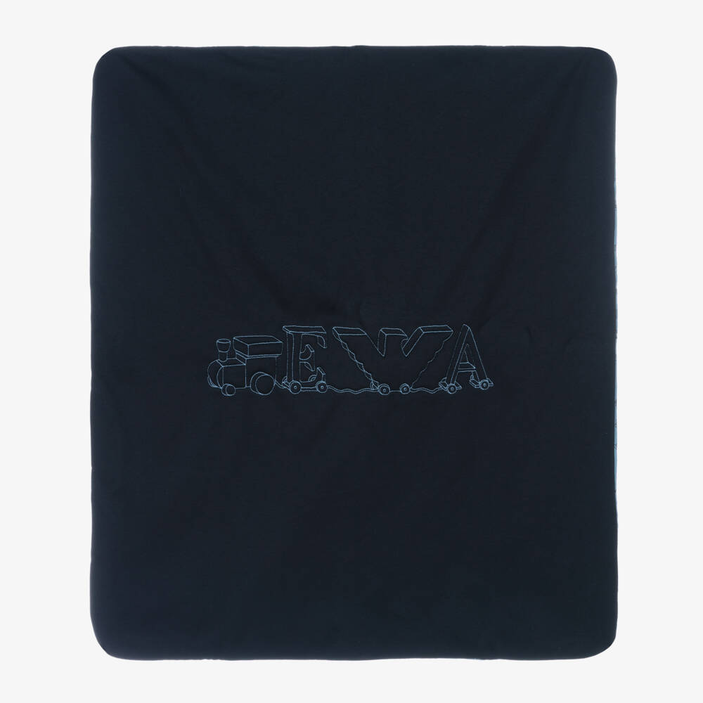 A blue padded blanket for baby boys by Emporio Armani, delicate and cosy, it is made in super soft organic cotton. Making a charming addition to the nursery, the navy blue jersey side is stitched with the EA Eagle logo, in the shape of a toy train. The lightweight dusky blue reverse is patterned in a nursery toy design, with the designer's signature Eagle logo pictured throughout.