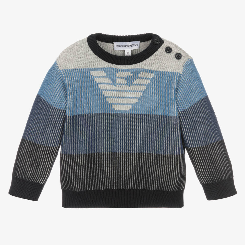 Striped cotton jumper for baby boys from Emporio Armani, in complementary shades of blue and grey. Knitted in a fine ribbed pattern, this classic crew neck style has the Italian brand's signature Eagle logo on the front. There are branded button fastenings on one shoulder for easy dressing.