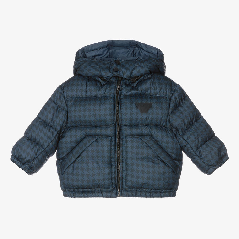 A dark blue puffer coat for baby boys by Emporio Armani, in a silky smooth recycled material. This coat is patterned in a lovely houndstooth design, with the brand's signature rubberised Eagle logo on the chest. Breathable and water-resistant, it has a useful zip and popper fastening, with faux fur lined pockets. The hood is removable and attaches to the coat with a zip.