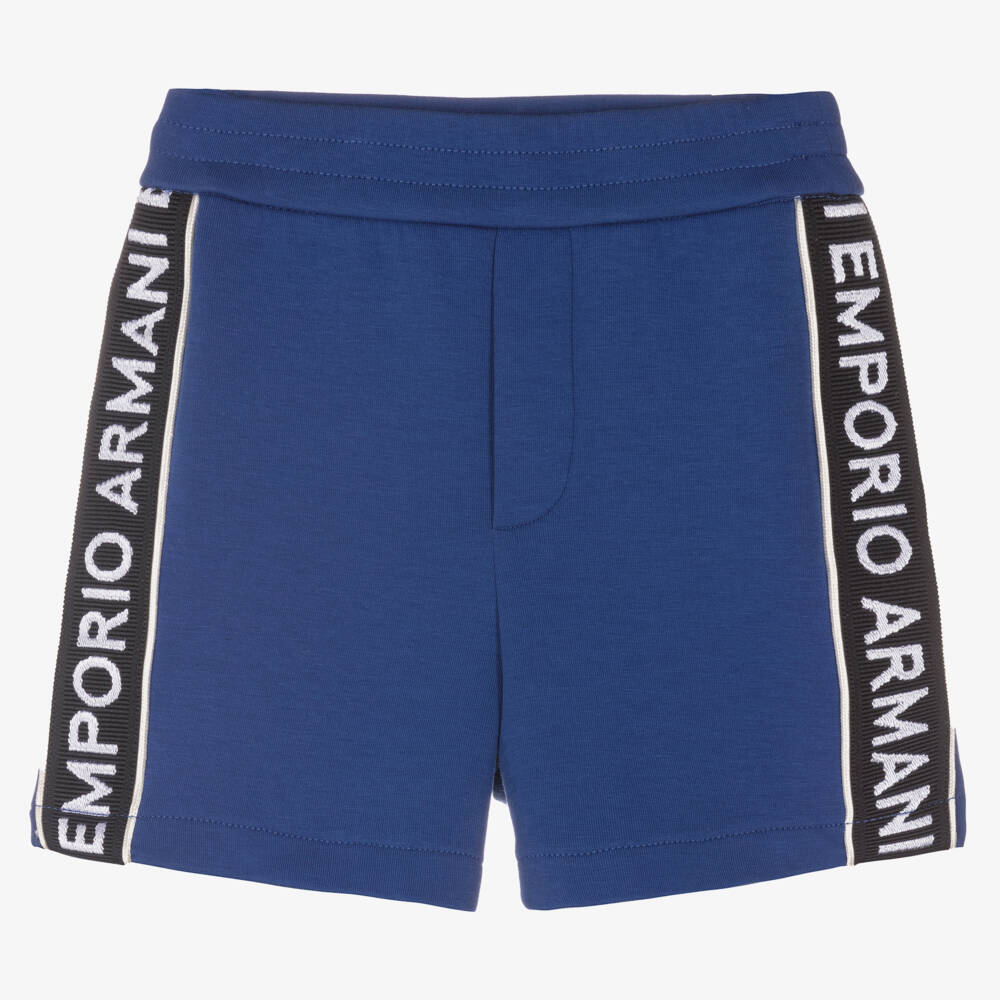Unmistakably Emporio Armani, these blue shorts for baby boys have a navy blue and silver embroidered logo trim on the front and back. A comfortable and casual style, they are made in soft double-faced cotton jersey and have an elasticated waistband for easy pull on.