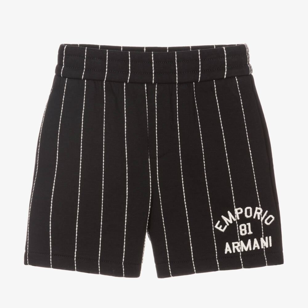 Baby boys dark navy blue cotton jersey shorts by Emporio Armani, with a white woven pin stripe pattern. Combining smart and casual effortlessly, these stylish shorts have an elasticated waist and concealed pockets. There is an embroidered white logo on one leg above the hem in a sporty varsity style.