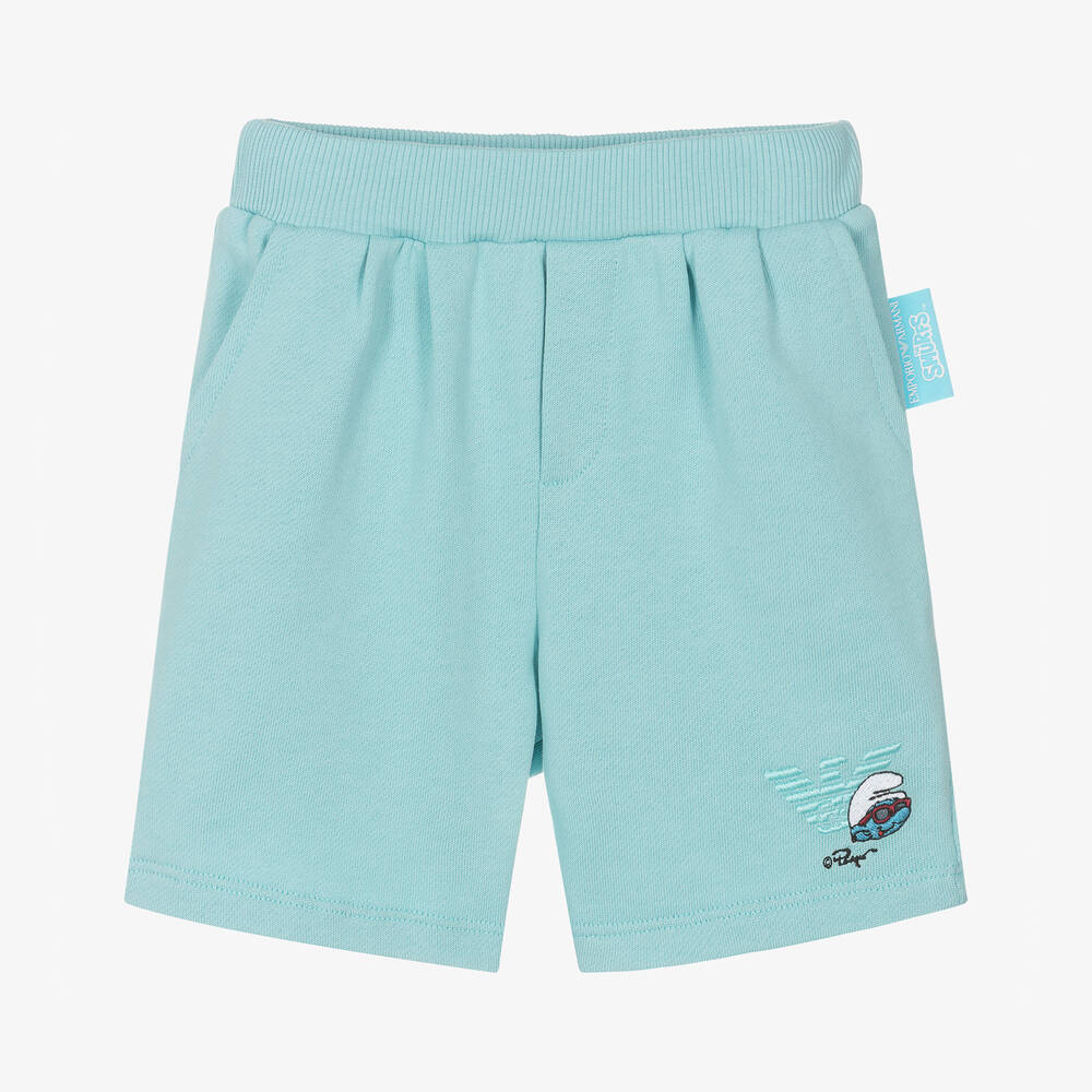 Pale blue cotton shorts for baby boys by Emporio Armani, made in soft mid-weight organic cotton jersey. There is a fun embroidered Smurfs graphic on one leg, incorporating the brand's Eagle logo, together with an embroidered tab on the side seam for designer appeal. They have slanted front pockets and the waistband is gently elasticated for a comfortable fit.
