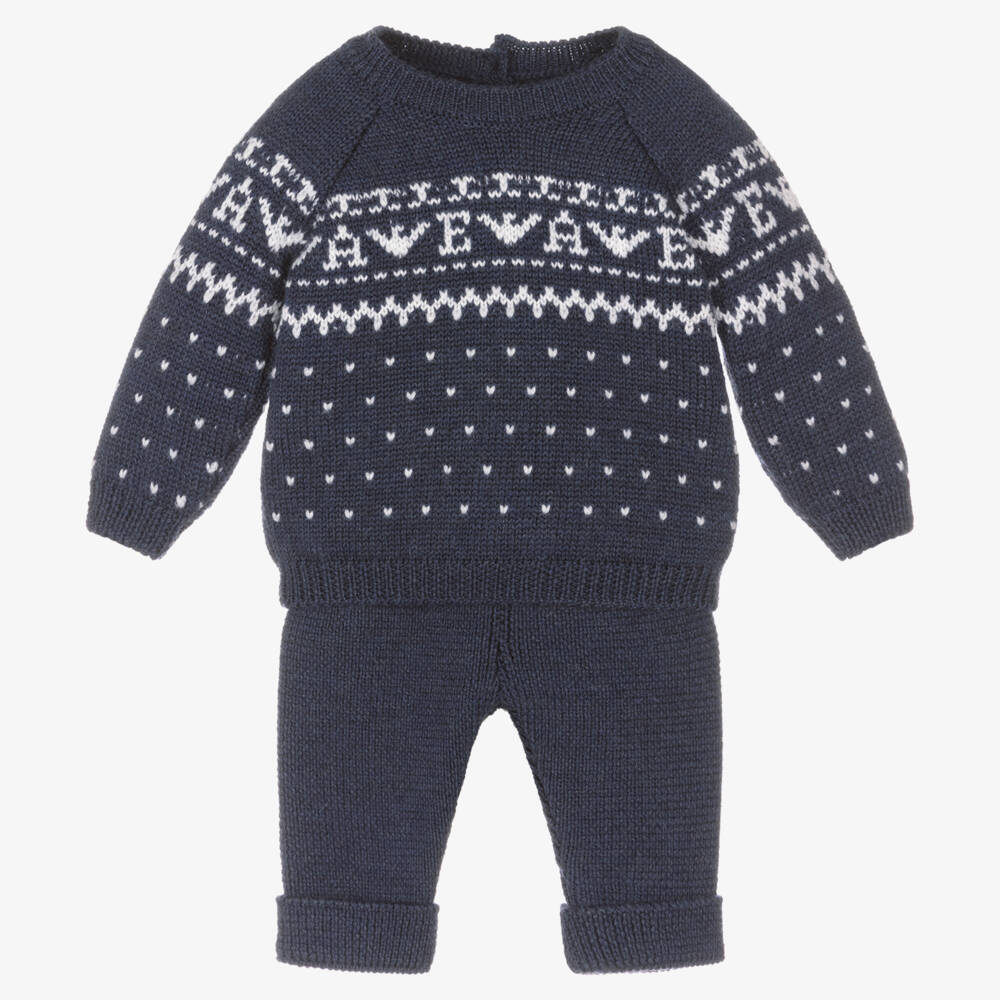 A navy blue trouser set for baby boys by Italian brand Emporio Armani, knitted in beautifully soft virgin wool. The designer's signature EA Eagle logo is patterned on the front in a charming Fair Isle design, with neat button fastenings on the back. The matching trousers are elasticated for comfort on little tummies and are finished with folded hems.