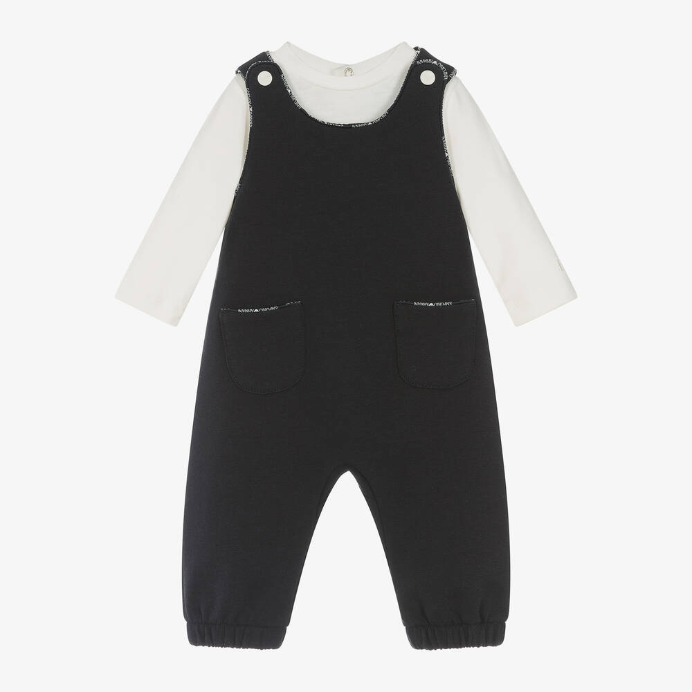 In off-white and navy blue, this casual babysuit set for boys is by Italian brand Emporio Armani. The dungarees have two patch pockets on the front, with logo-branded trims for a subtle designer touch. There are shoulder poppers for easy fastening and elasticated ankles for a snug fit. The bodyvest secures with poppers on the back and between the legs. Both pieces are made in soft cotton jersey for comfortable wear.