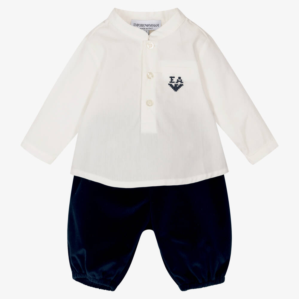 White and dark blue trousers set for baby boys by Emporio Armani, made in the softest cotton. Smartly styled, the collarless poplin shirt has the brand's EA Eagle logo embroidered beneath the faux pocket, with pearlescent half-button fastenings. The velvet trousers have decorative buttons on the front pockets and an elasticated waistband for a comfortable fit. Comes with a lovely branded storage bag.