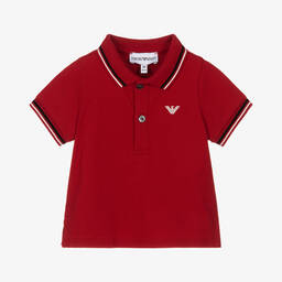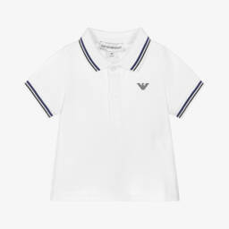 Baby boys white polo shirt by Emporio Armani, made in soft cotton piqué. This short-sleeved top has navy blue and black stripes on the ribbed collar and cuffs. Instantly recognisable, the signature black rubberised Eagle logo can be seen on the chest.