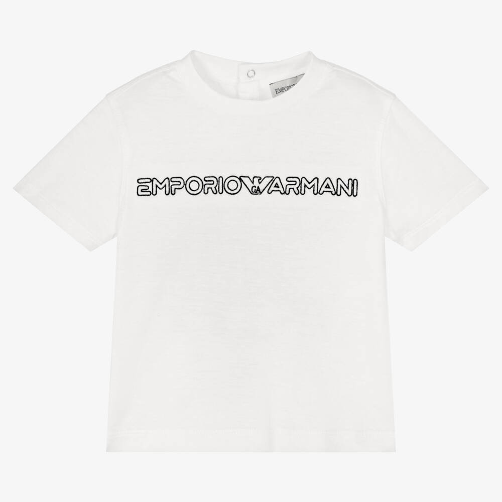 From Italian brand Emporio Armani, this baby boys off-white T-shirt is made in a soft lyocell and cotton blend jersey. Great for everyday wear, it has an embroidered white logo across the chest and popper fastenings on the back.