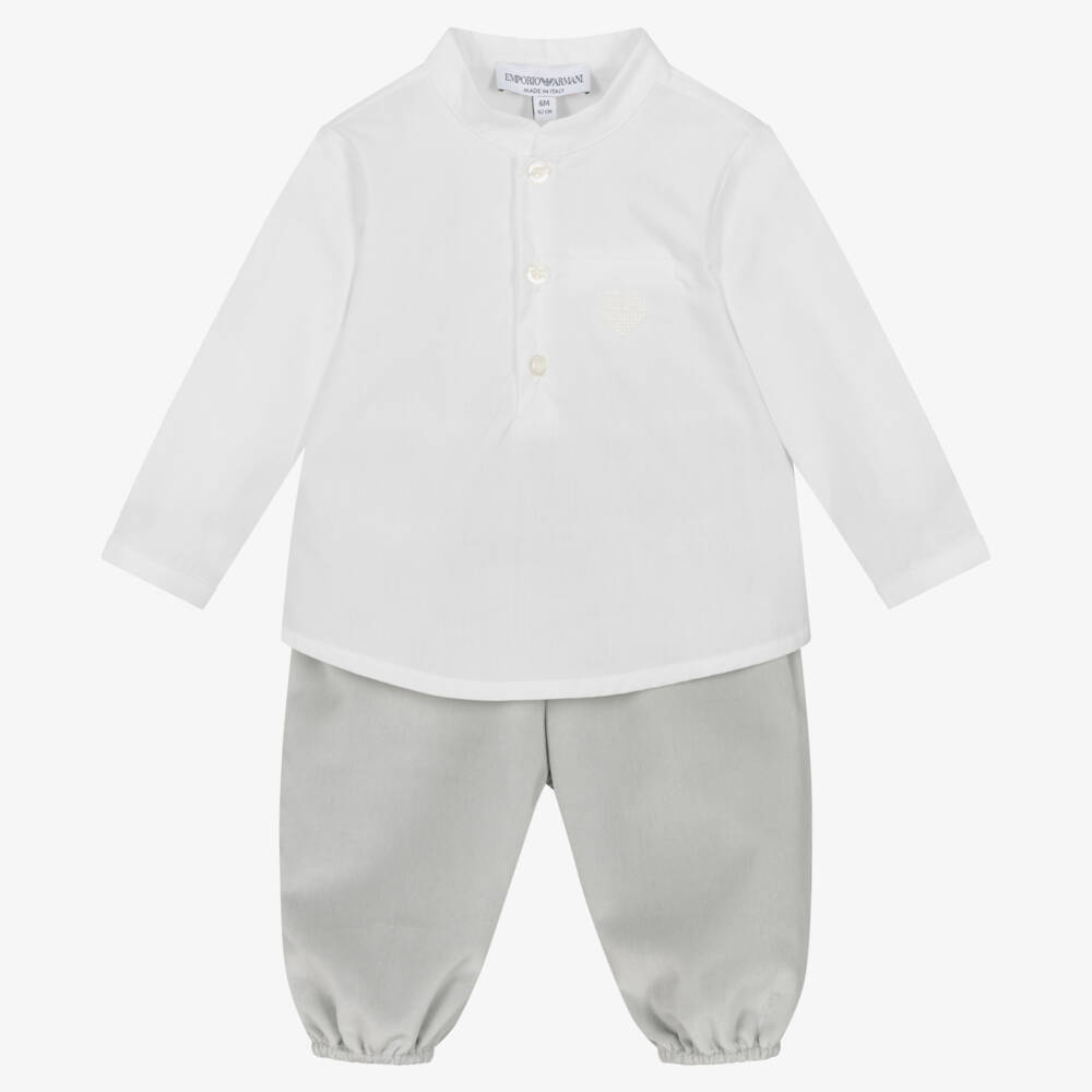 White and grey trousers set for baby boys by Emporio Armani, made in the softest cotton. Smartly styled, the collarless poplin shirt has the brand's EA Eagle logo embroidered beneath the faux pocket, with pearlescent half-button fastenings. The velvet trousers have decorative buttons on the front pockets and an elasticated waistband for a comfortable fit. Comes with a lovely branded storage bag.