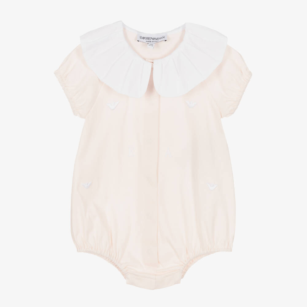 Lovely pale pink cotton shortie for baby girls, by luxury Italian designer Emporio Armani. Made in soft organic cotton jersey, it has the brand's signature logos embroidered delicately on the front in white. Fastening with useful poppers on the back and between the legs, it has an oversized ruffle collar and puffed sleeves for an adorable finish.
