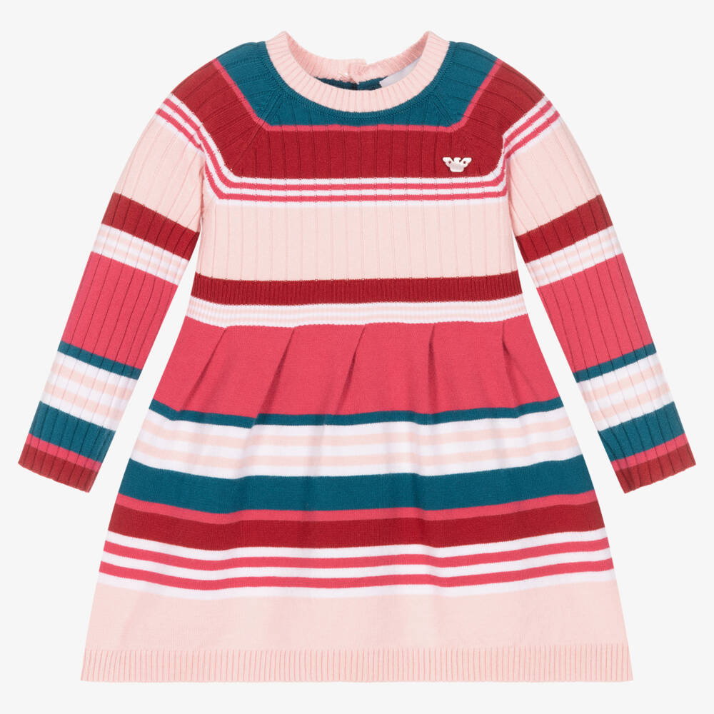Pink, red and blue striped dress for baby girls by Emporio Armani, knitted in a soft and stretchy viscose blend. Cute and casual, this comfortable dress has a pink Eagle logo charm on the chest for a subtle designer touch. The bodice and long, raglan sleeves have a lightly ribbed finish and the two button fastenings on the back are discreetly branded.