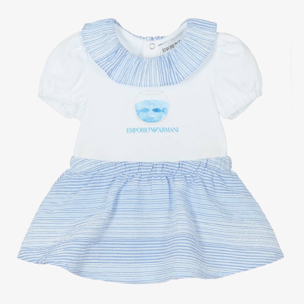 Cute white and blue skirt set for baby girls, by Emporio Armani. Woven in soft cotton jersey, the plain white bodysuit has a cute goldfish bowl printed on the front with the brand's iconic logo in blue. Fastening with easy poppers on the back and between the legs, it has a blue striped ruffle collar and puffed sleeves. It pairs with a matching blue striped cheesecloth skirt with attached knickers and elasticated trims.