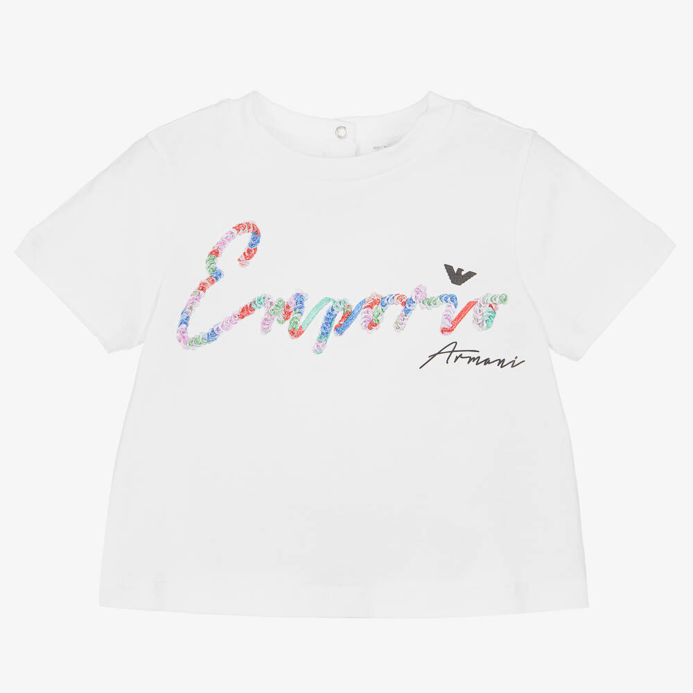 Baby girls white organic cotton T-shirt by Emporio Armani, beautifully appliquéd with an Emporio Armani multicoloured logo and black Eagle print. Made in soft lightweight jersey for a comfortable wear. This casual top has a lightly ribbed crew neckline and useful popper fastenings on the back, embossed with Eagle logos for an added branded touch. It is made partially from recycled and organic fibres.