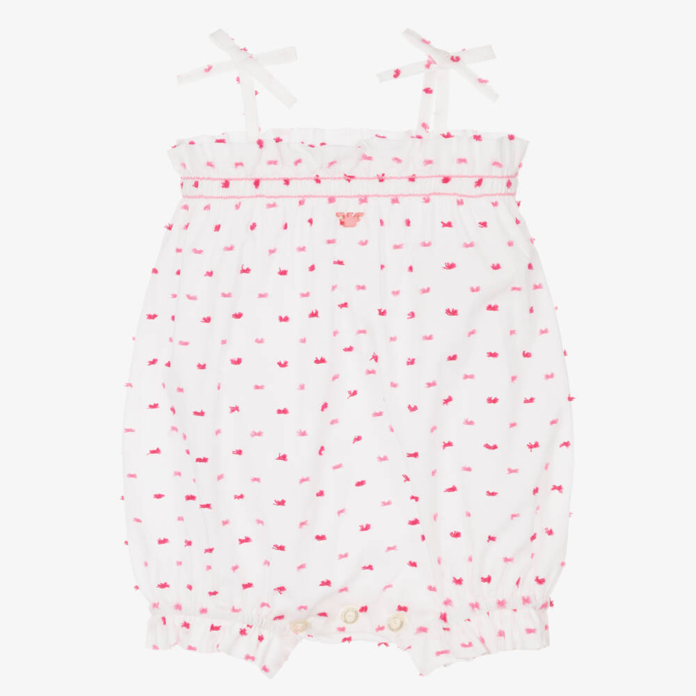 Lovely white shortie for baby girls by Emporio Armani, woven in soft cotton. Embroidered with a sweet raised pink thread all-over, it has a shirred panel at the top with sweet decorative bows on the straps. The iconic Eagle logo features on a pink charm on the chest and the elasticated leg holes have ruffle trims for a girly look. It fastens with buttons between the legs for easy dressing.