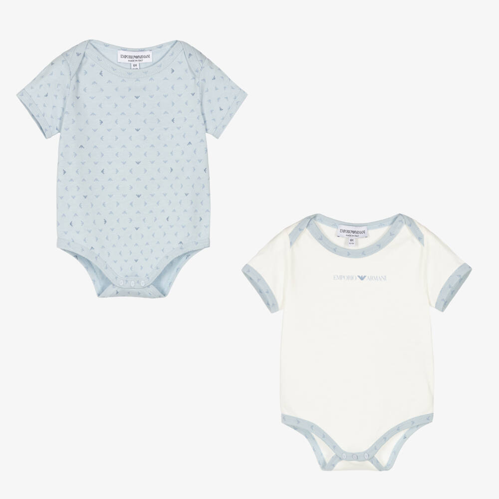 Pack of two ivory and blue bodyvests for baby boys by Emporio Armani, made in soft cotton jersey. Instantly recognisable, one is finished with the Emporio Armani logo on the chest with Eagle logo trims. The other is patterned in an all-over Eagle logo print in tonal shades of blue. Both have branded popper fastenings between the legs, making changing effortless.