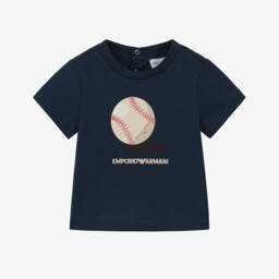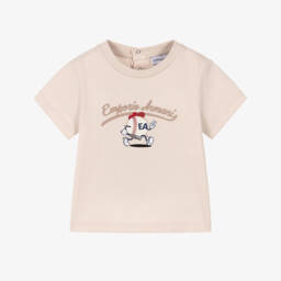 Little boys beige cotton T-shirt by Emporio Armani, with a cute baseball graphic and logo printed on the front. Made from soft and comfortable jersey, it has branded button fastenings on the back to help with dressing.