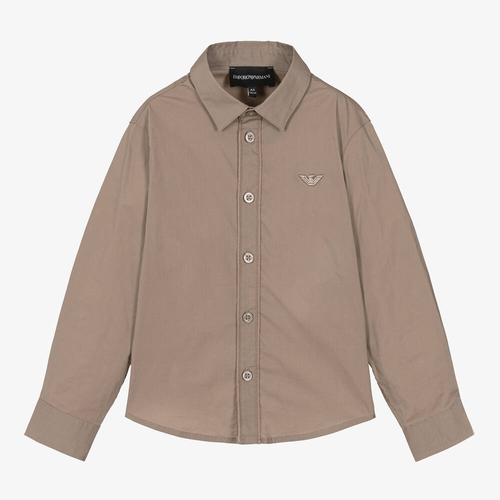 Dark beige cotton shirt for boys by Italian brand Emporio Armani, made in smooth poplin with added stretch for comfort. Suitable for smart-casual wear, it has long sleeves, a pointed collar, and branded button fastenings. A tonal embroidered Eagle logo on the collar adds a signature finish.