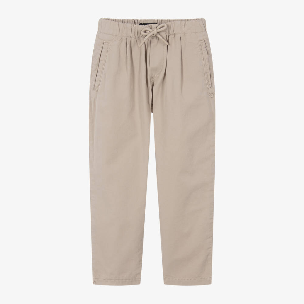 Beige cotton trousers for boys by Italian brand Emporio Armani, made from soft twill. This comfortable, casualwear style has an elasticated waistband with a decorative drawstring, useful front pockets and decorative back pocket detail. A relaxed fit that tapers towards the ankle, they have the designer's tonal Eagle logo embroidered on one side for a subtle branded touch.