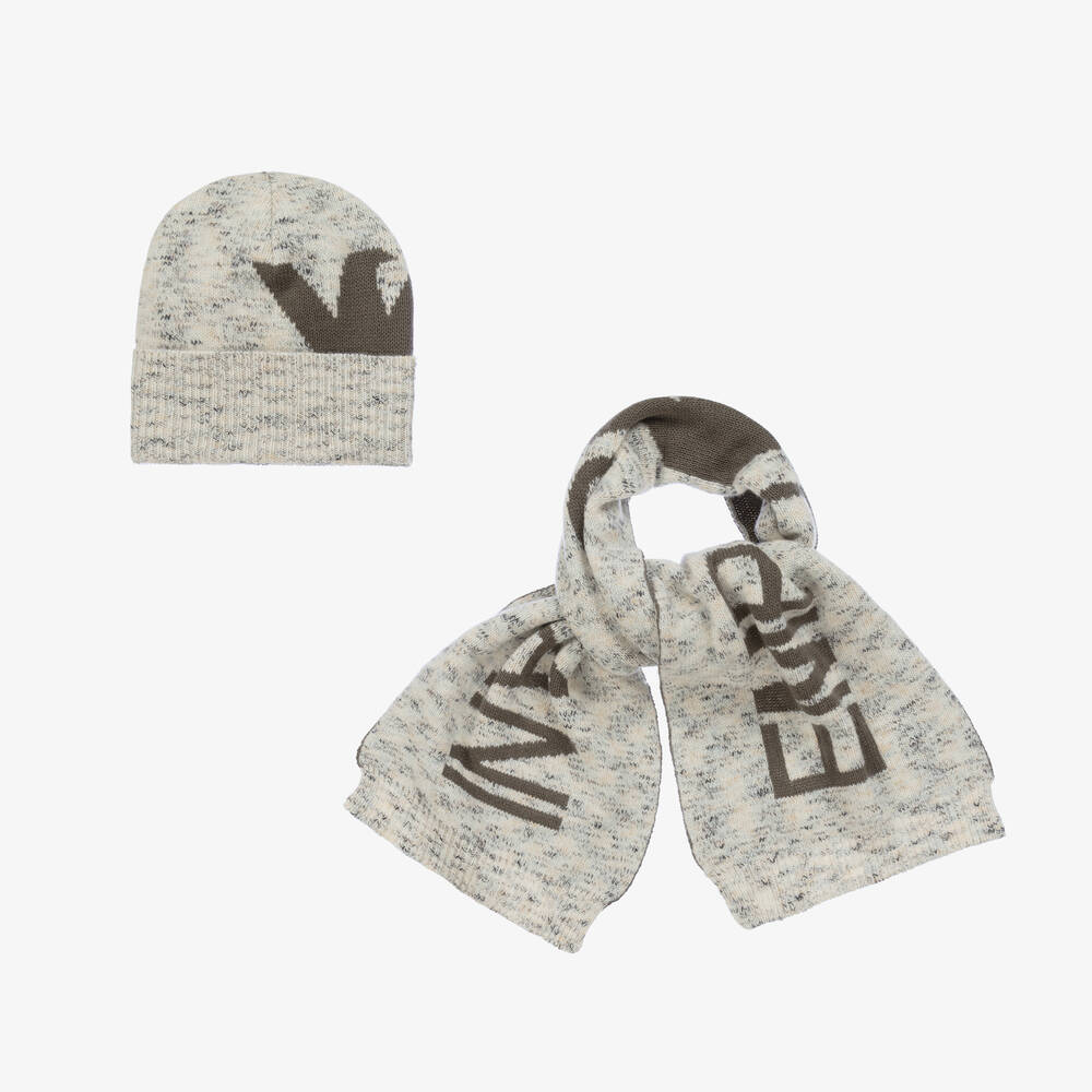 A cool beige marl hat and scarf set for boys by Emporio Armani, knitted in a blend of luxuriously warm cotton and wool yarns. The scarf has a large brown intarsia logo motif, incorporating the iconic Eagle for a bold signature look. The matching hat has a deep ribbed turn-up brim.