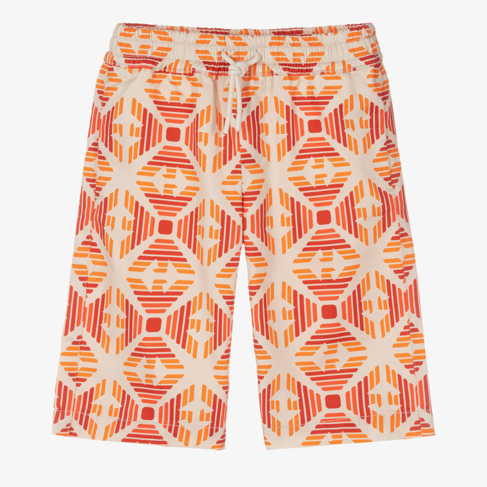 Cool beige Mini-me shorts for boys from luxury designer Emporio Armani. These soft cotton twill bottoms have a vibrant, abstract print in tones of orange and red, incorporating the Italian label's signature Eagle logo. For a comfortable fit, the elasticated waist is adjustable with a branded drawstring. These shorts contain organic and recycled fibres.