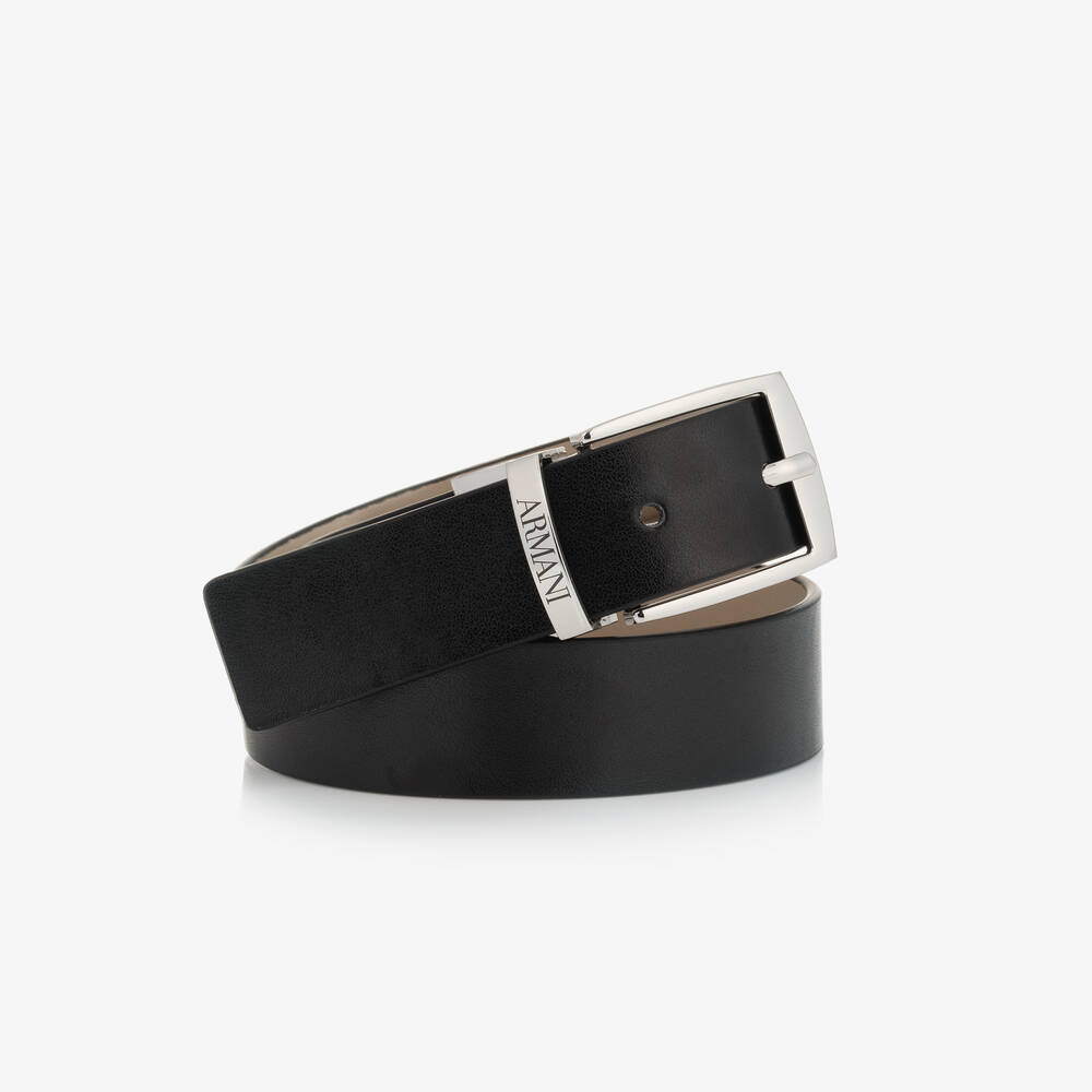 A smart reversible belt for boys by Italian brand Emporio Armani, black on one side and light beige on the other side. This classic accessory is made in luxuriously soft and smooth faux leather. Offering two looks in one, the adjustable silver-tone metal buckle simply twists around to switch sides and has an embossed logo for a distinctive look.