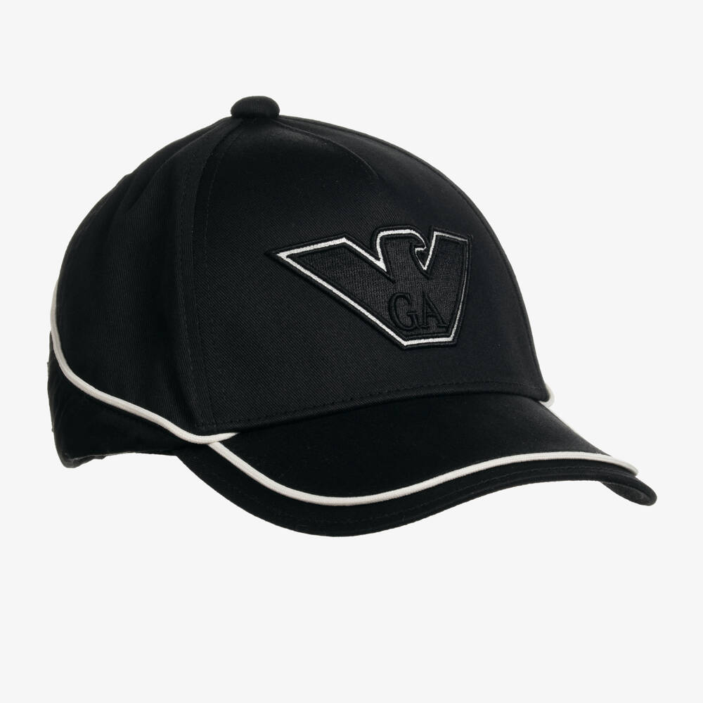 A cool black baseball cap for boys by Emporio Armani, made from soft cotton twill with contrast white piping. Instantly recognisable, it has an embroidered Eagle logo appliqué on the front and the designer's initials on the back. The stiff peak helps protect eyes from the sun and the back velcro strap can be adjusted for a comfortable fit.