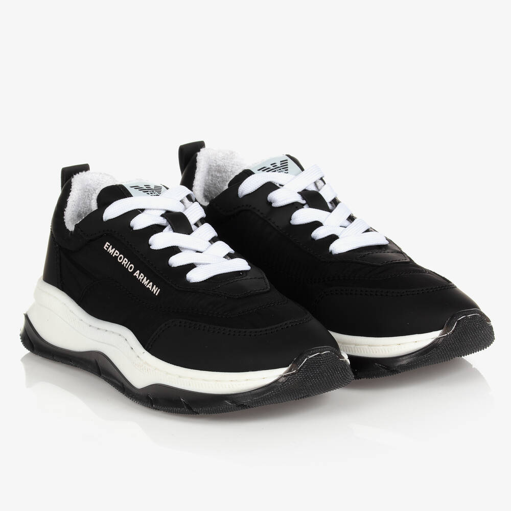Boys black trainers by Emporio Armani, with white laces and trims. Lined in towelling for added comfort, they have non-slip rubber outer soles for improved grip on wet or slippery surfaces. These classically stylish trainers are finished with the brand's iconic Eagle logo on the tongue and a logo print on the side.