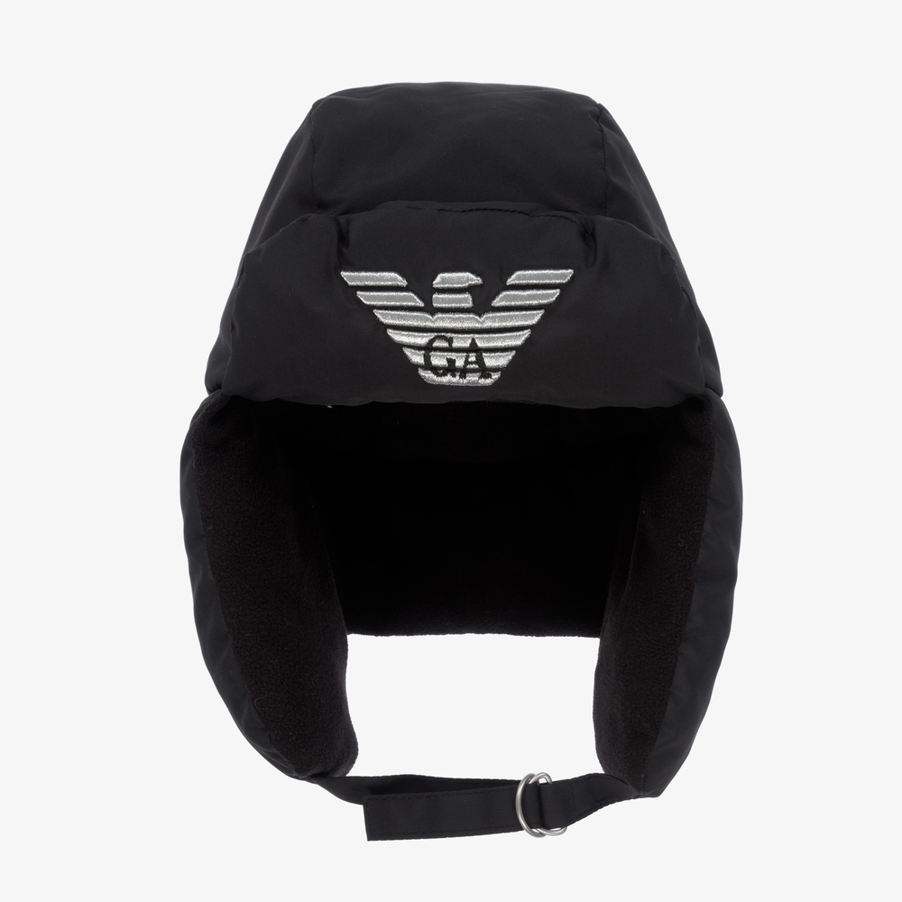Cosy black padded trapper hat for boys, by Emporio Armani. Soft and silky with a warm fleece lining, it has oversized Eagle logo embroidery on the front popper-fastening panel in metallic silver, and it easily fastens underneath the chin with an adjustable metal pull.