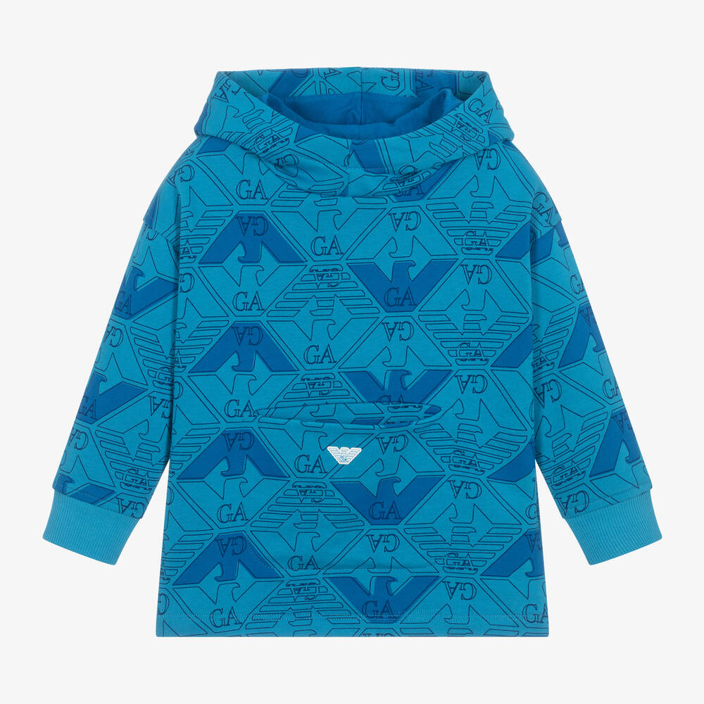 Blue hoodie for boys by Emporio Armani, made in soft, mid-weight cotton jersey. Part of the brand's EA Crew capsule, it is patterned with iconic Eagle logos. Stylish and comfortable for casual wear, it has cosy ribbed cuffs on the long sleeves and a concealed pocket on the front with a white rubberised Eagle logo.