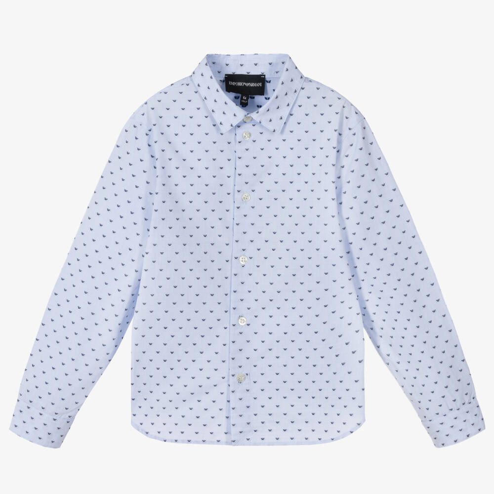 Boys pale blue smart casual shirt by Emporio Armani, made in soft cotton poplin. Unmistakably Armani, the designer's Eagle logo can be found all-over as a navy blue repeat pattern. It fastens easily with branded buttons on the front and cuffs.