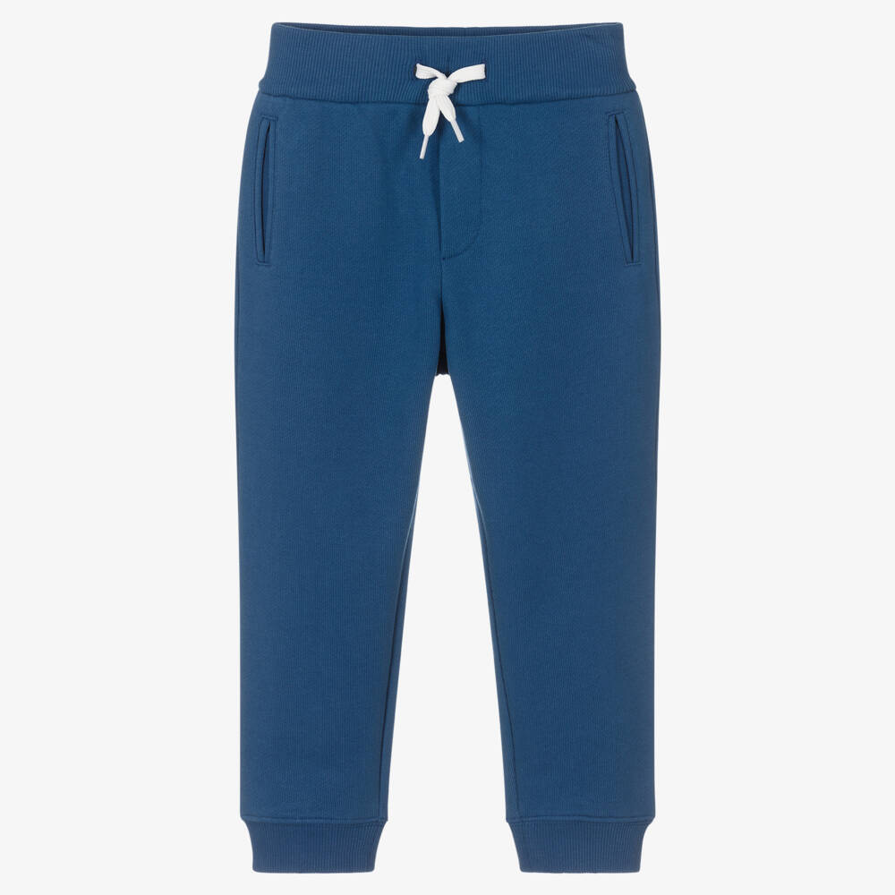 Royal blue Mini-me joggers for boys by Emporio Armani, from the brand's Earctic Capsule collection. Cosy and comfy to wear, they are made in mid-weight cotton jersey, with a ribbed elasticated waist and faux drawstring. There are useful side pockets, ribbed ankle cuffs, and a grey rubberised Earctic logo on one leg. This product is made from organic fibres.
