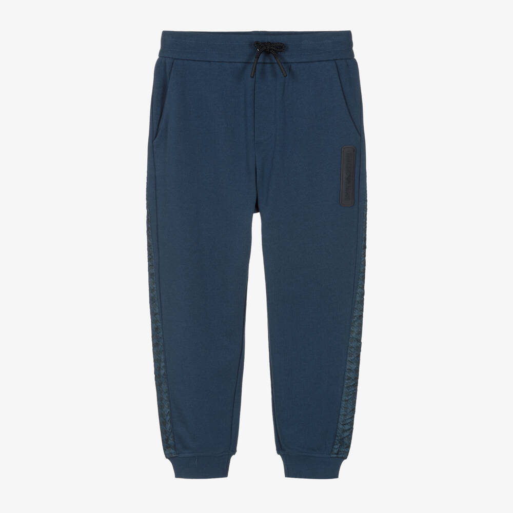Dark blue joggers for boys by Emporio Armani, made in super soft cotton jersey. These cool joggers have a rubberised logo on the front, with smooth houndstooth panels on the sides. A faux drawstring and side seam pockets finish this casual piece.