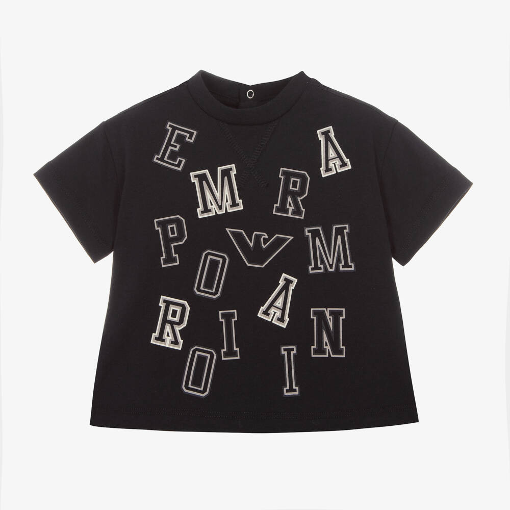 Navy blue cotton T-shirt for little boys from renowned luxury label Emporio Armani. Made with delicate skin in mind, this soft jersey T-shirt fastens with branded poppers on the back for dressing made simple. Unmistakably designer, the front is stamped with grey logo letters and the famous Eagle motif.