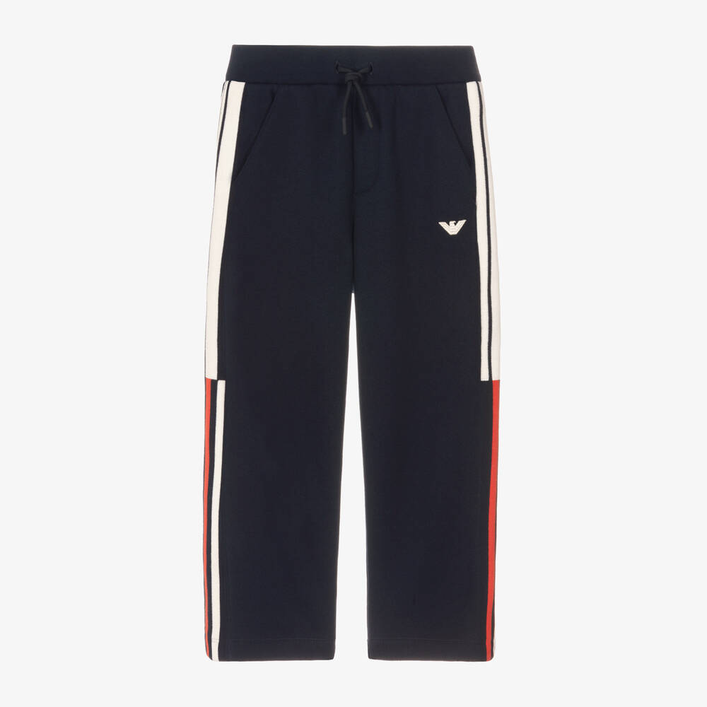 Navy blue joggers for little boys from luxury designer Emporio Armani, made from soft and stretchy cotton in a cosy, heavier weight. The Italian label's ivory Eagle logo embroidery is detailed on the front, instantly recognisable for a cool designer look. Navy blue, red and ivory stripes trim the sides for sports-luxe styling. These relaxed-fit joggers have a comfortable, elasticated waist with faux drawstrings, a straight-leg silhouette, and two pockets on the front.
