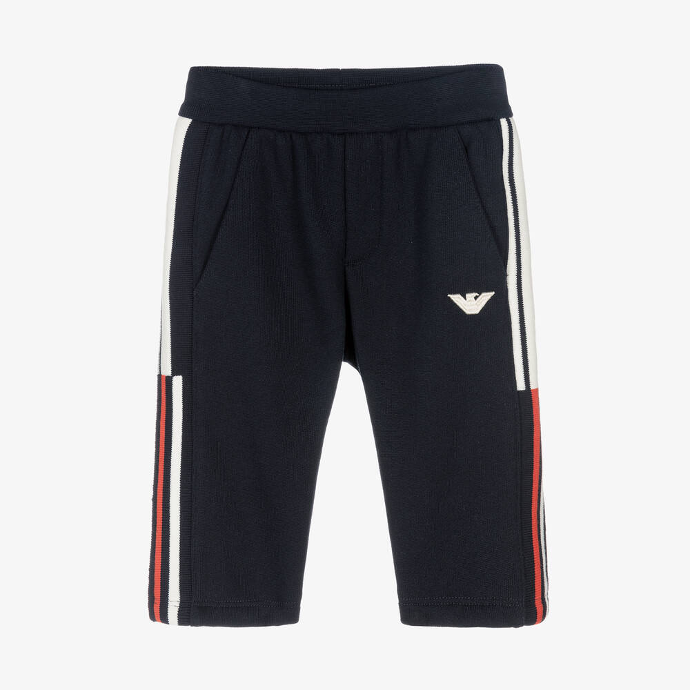 Navy blue joggers for little boys from luxury designer Emporio Armani, made from soft and stretchy cotton jersey in a cosy heavier weight. The Italian label's Eagle logo embroidery appears on the front, instantly recognisable for that signature designer look. Navy blue, red and ivory stripes trim the sides for sports-luxe styling. These relaxed-fit joggers have an elasticated waist to help with dressing and two pockets on the front.