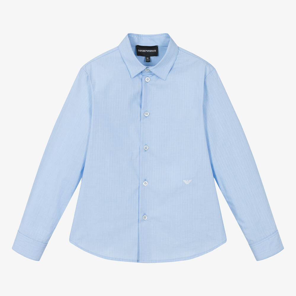 Light blue shirt for boys by Italian brand Emporio Armani, made in soft cotton with subtle, vertical stripes woven into the fabric. Timelessly smart, it has a pointed collar, long sleeves and branded button fastenings on the front and cuffs. The designer's Eagle logo can be seen on the front in white embroidery for a signature touch.