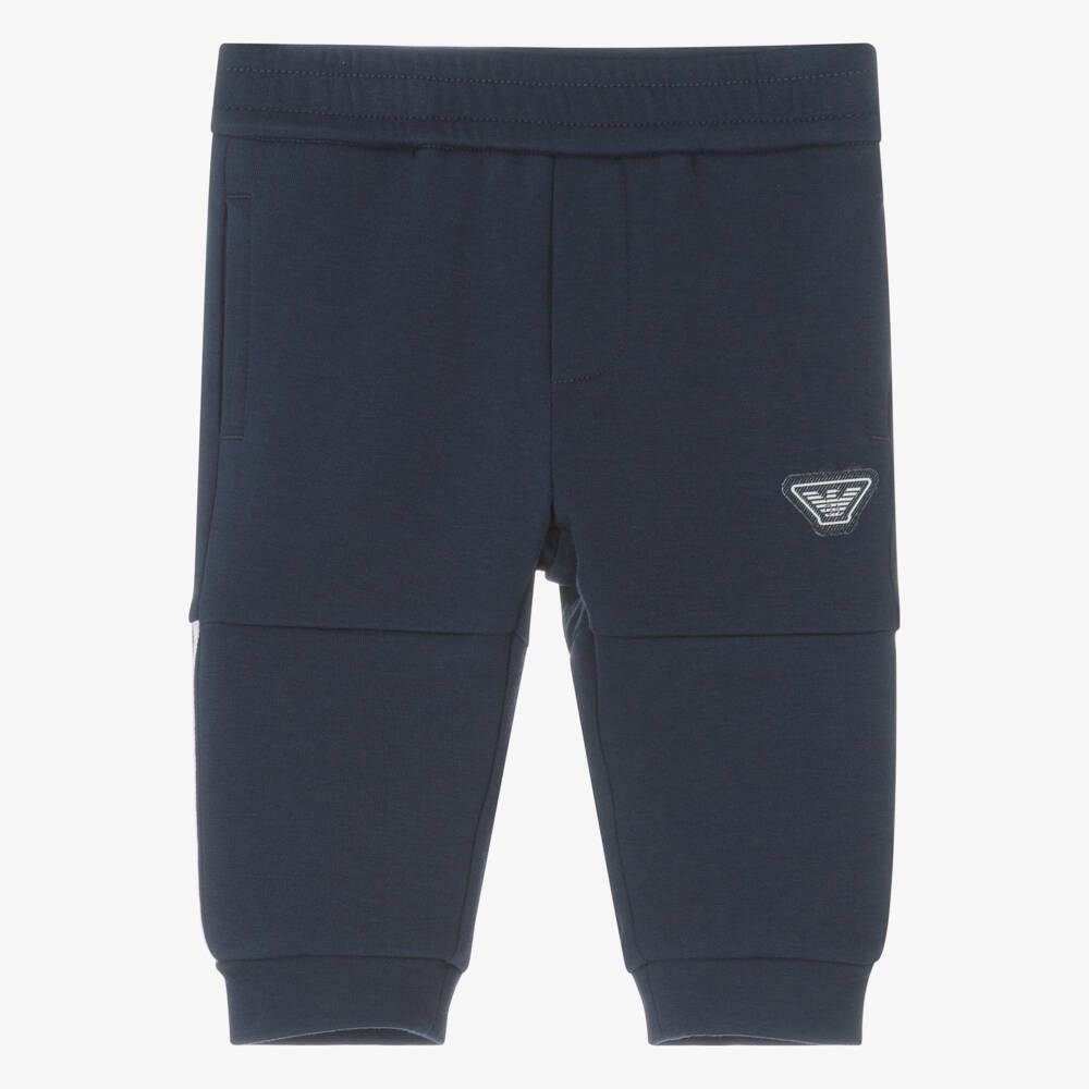 Navy blue cotton joggers for little boys by iconic Italian designer Emporio Armani, with sporty white logo taping on the lower legs. Made in super soft and stretchy jersey, they have a comfortable, elasticated waistband, concealed side pockets and the brand's signature Eagle logo badge on one side.