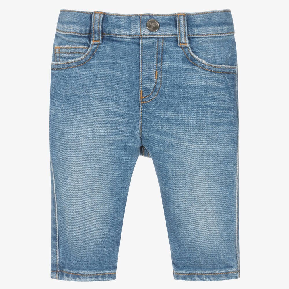 Washed blue jeans for little boys from Italian brand Emporio Armani, made in soft cotton denim. They have classic five pocket styling and a washed and worn look, with an elasticated waistband for ease. A branded stud on the front and the iconic Eagle logo plate on the back add a designer finish.