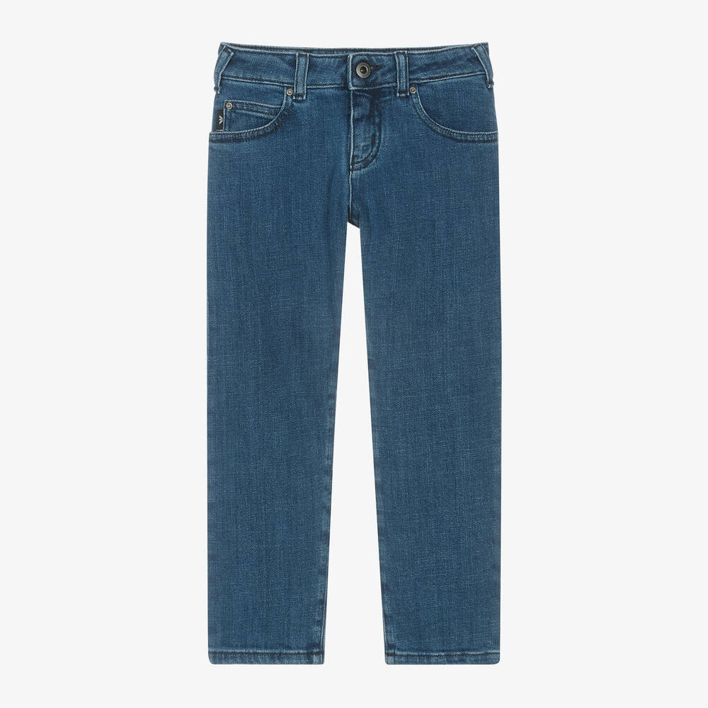 Mid-blue straight leg denim jeans for boys by luxury Italian brand Emporio Armani, made in soft cotton with a slight stretch. Designed with classic five pocket styling, they feature the designer's signature metal Eagle logo on one back pocket for a subtle branded finish. They fasten with a button and zip and have a useful adjustable waist.