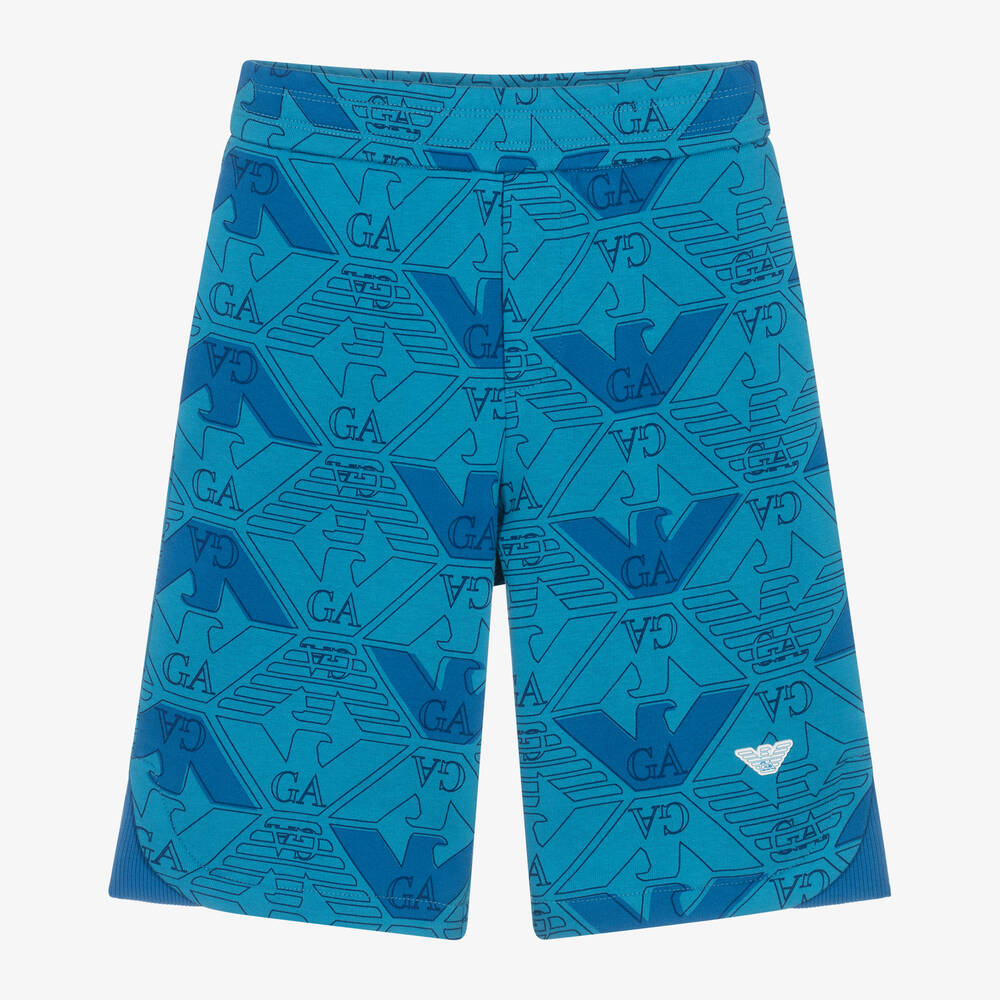 Blue graphic shorts for boys by Emporio Armani, part of the brand's EA Crew capsule. With a cool longer length, they are patterned with the iconic Eagle logos in navy blue outlines with darker blue accents. They are made in super soft cotton sweatshirt jersey with an elasticated waist for comfortable wear and ribbed trims. There are neatly concealed pockets on the side seams and a rubberised logo by the hem.