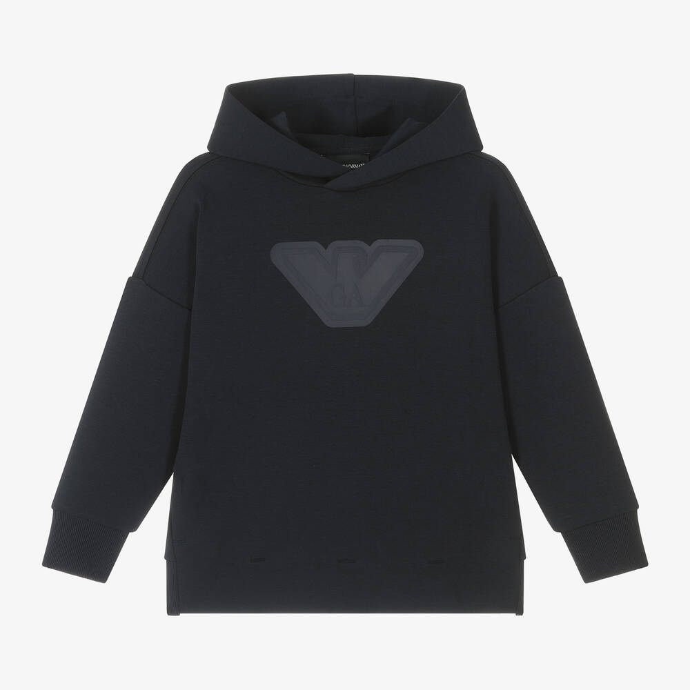 Navy blue hooded sweatshirt for boys by Emporio Armani, with the Italian label's Eagle logo printed on the front for distinctive designer appeal. Cotton-rich, it is made in luxurious, double-faced jersey with concealed side seam pockets.
